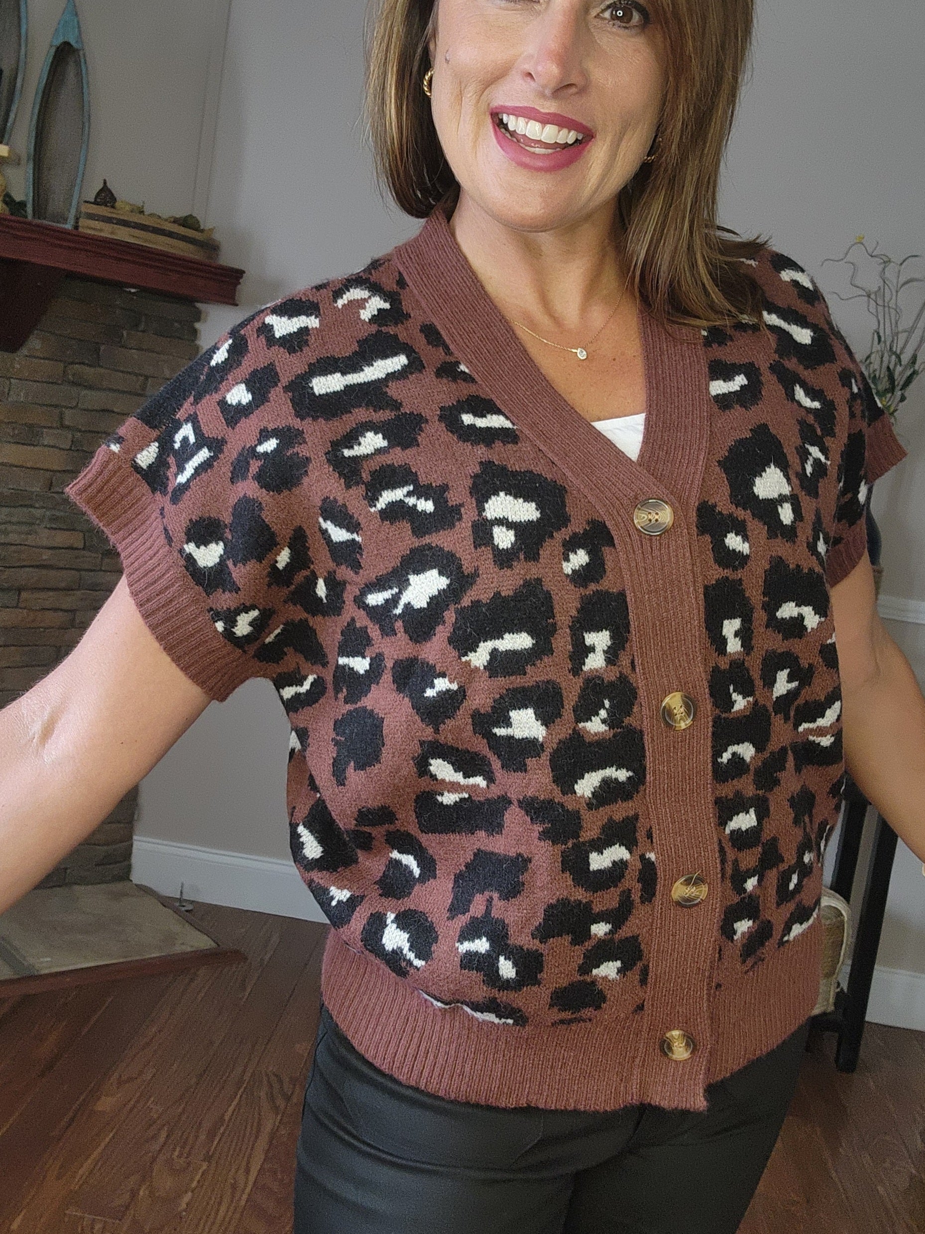 Elevate your style with the Oakley Sweater Vest, featuring a bold leopard knit pattern and sleek tortoiseshell buttons. Its v-neck and sleeveless design create a daring, edgy look, while the slightly cropped, boxy silhouette with a ribbed knit waistband adds modern flair. Perfect for making a statement, this vest blends fierce fashion with cozy comfort. Perfect for layering!